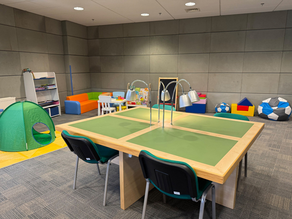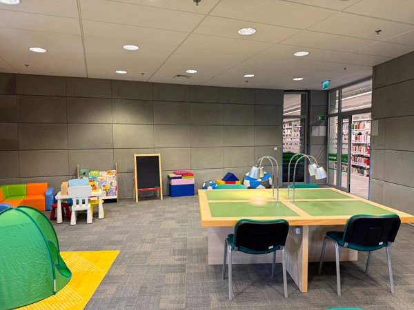 Strefa została zaprojektowana jako miejsce umożliwiające rodzicom i opiekunom realizację pracy naukowej, dydaktycznej lub indywidualnej wymagającej skupienia, przy jednoczesnym zapewnieniu dzieciom komfortowego i bezpiecznego pobytu. Użytkownicy mogą w niej studiować, przygotowywać materiały badawcze, pisać prace dyplomowe lub wykonywać inne obowiązki akademickie, mając swoje pociechy w bezpośredniej bliskości. Wyposażenie Strefy dostosowano do potrzeb dzieci w różnym wieku. Znajdują się w niej piankowe klocki, tablice, zestawy do rysowania i kolorowania oraz inne materiały plastyczne rozwijające kreatywność najmłodszych. Zgromadzony zbiór literatury dziecięcej obejmuje publikacje dobrane do różnych grup wiekowych – od książeczek obrazkowych po tytuły rozwijające ciekawość poznawczą i kształtujące zainteresowanie czytaniem. Z myślą o komforcie rodzin z niemowlętami przestrzeń wyposażono w kojec i krzesełko do karmienia, a w sąsiadującej toalecie zainstalowano przewijak. Rozwiązania te pozwalają rodzicom i opiekunom korzystać z infrastruktury bibliotecznej bez konieczności rezygnowania z opieki nad dzieckiem, przy zachowaniu warunków sprzyjających nauce i pracy.
